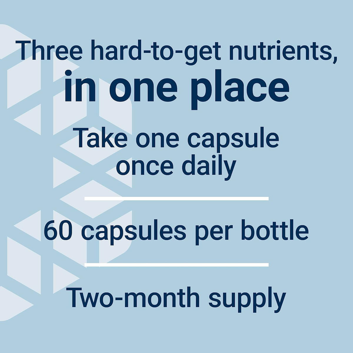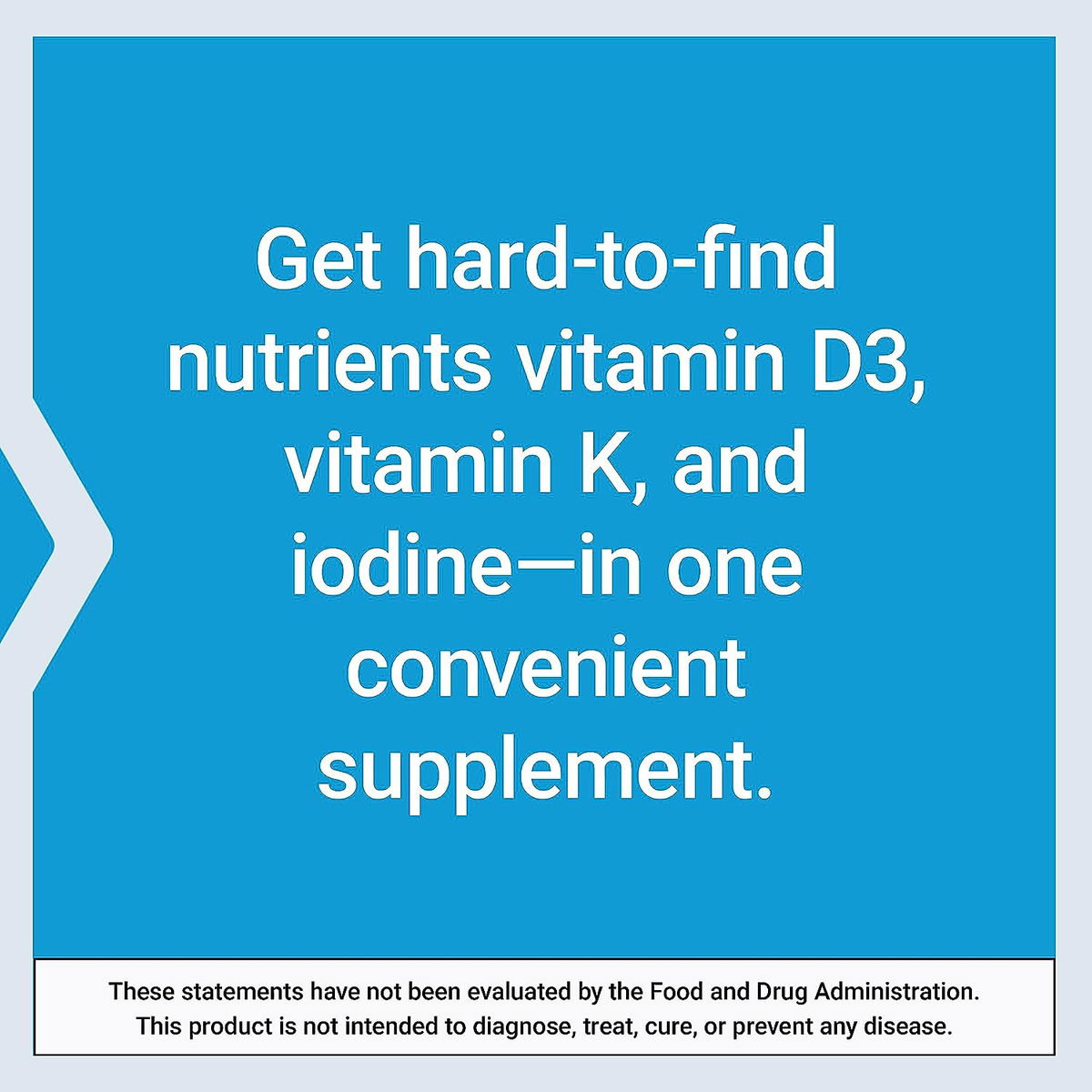 Esta fórmula proporciona 125 mcg (5000 UI) de vitamina D3, 2100 mcg de vitamina K y 1000 mcg de yodo en un práctico suplemento de una vez al día para apoyar la salud de los huesos, el cerebro, la tiroides y los vasos sanguíneos.