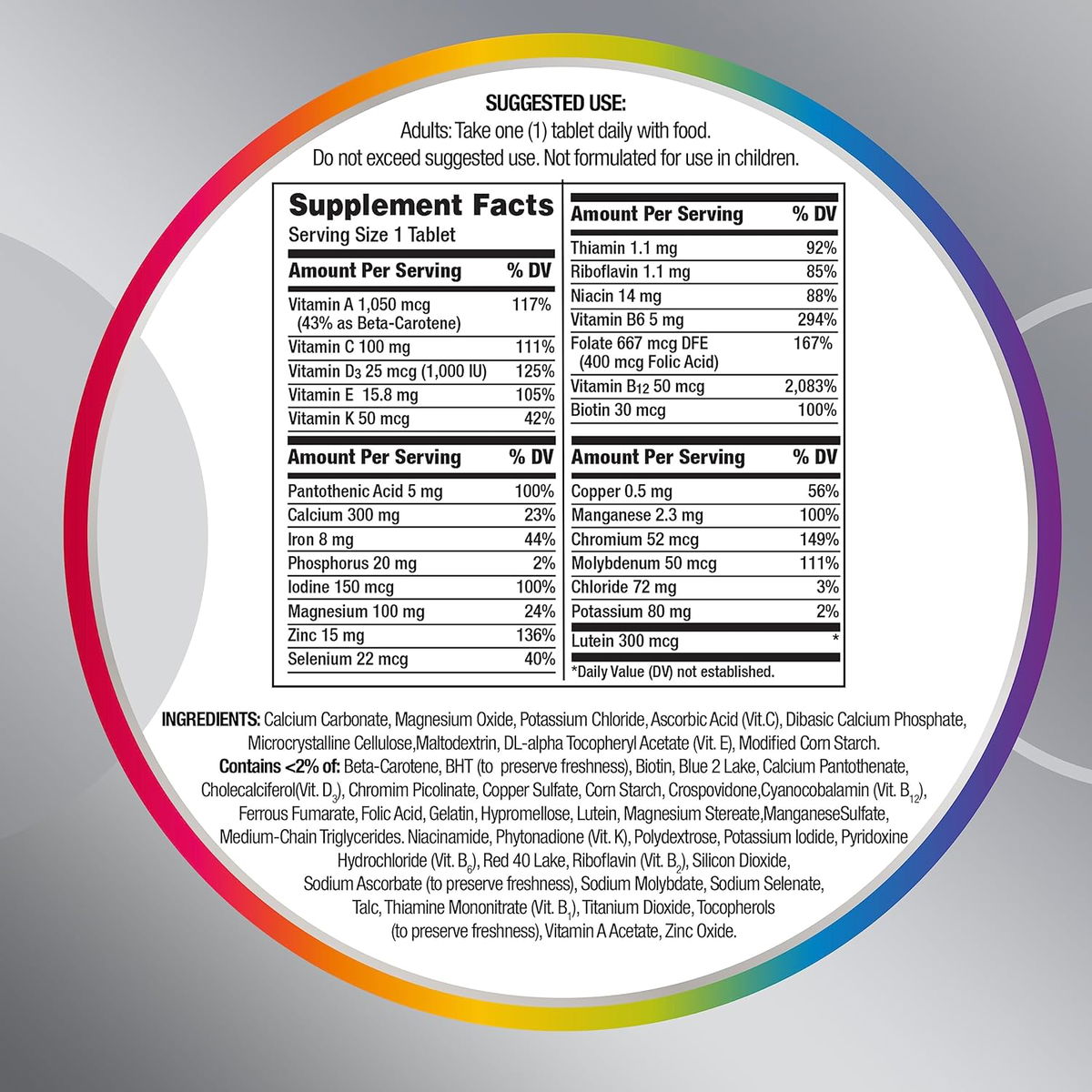 Carbonato de calcio, óxido de magnesio, cloruro de potasio, ácido ascórbico (Vit. C), fosfato de calcio dibásico, celulosa microcristalina, maltodextrina, acetato de tocoferilo DL-alfa (Vit. E), Almidón de maíz modificado. Contiene <2% de: Betacaroteno, BHT (para preservar la frescura), Biotina, Blue 2 Lake, Pantotenato de Calcio, Colecalciferol (Vit. D3), picolinato de cromo, sulfato de cobre, almidón de maíz, crospovidona, cianocobalamina (Vit. B12), fumarato ferroso, ácido fólico, gelatina, hipromelosa, luteína, estearato de magnesio, sulfato de manganeso, triglicéridos de cadena media, niacinamida, fitonadiona (Vit. K), polidextrosa, yoduro de potasio, clorhidrato de piridoxina (Vit. B6), Lago Rojo 40, Riboavin (Vit. B2), dióxido de silicio, ascorbato de sodio (para preservar la frescura), molibdato de sodio, selenato de sodio, talco, mononitrato de tiamina (Vit. B1), dióxido de titanio, tocoferoles (para preservar la frescura), acetato de vitamina A, óxido de zinc.