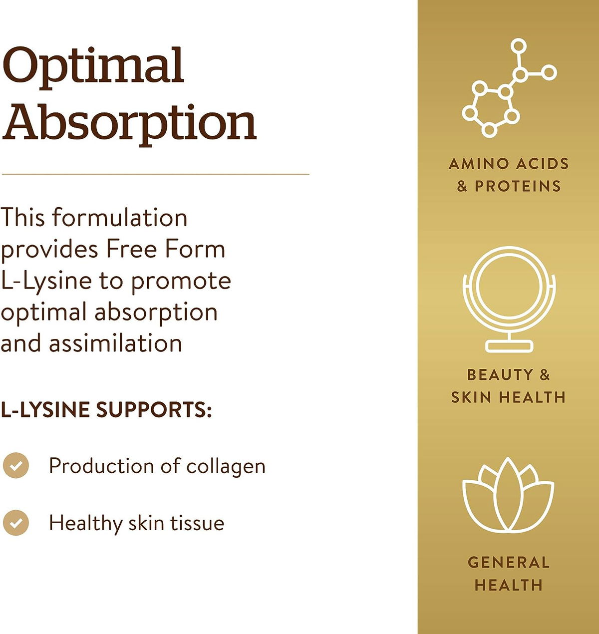 FÁCIL DE TOMAR: la formulación de Solgar L-Lisina 1000 mg proporciona al cuerpo L-Lisina de forma libre para promover una absorción y asimilación óptimas en los sistemas del cuerpo.