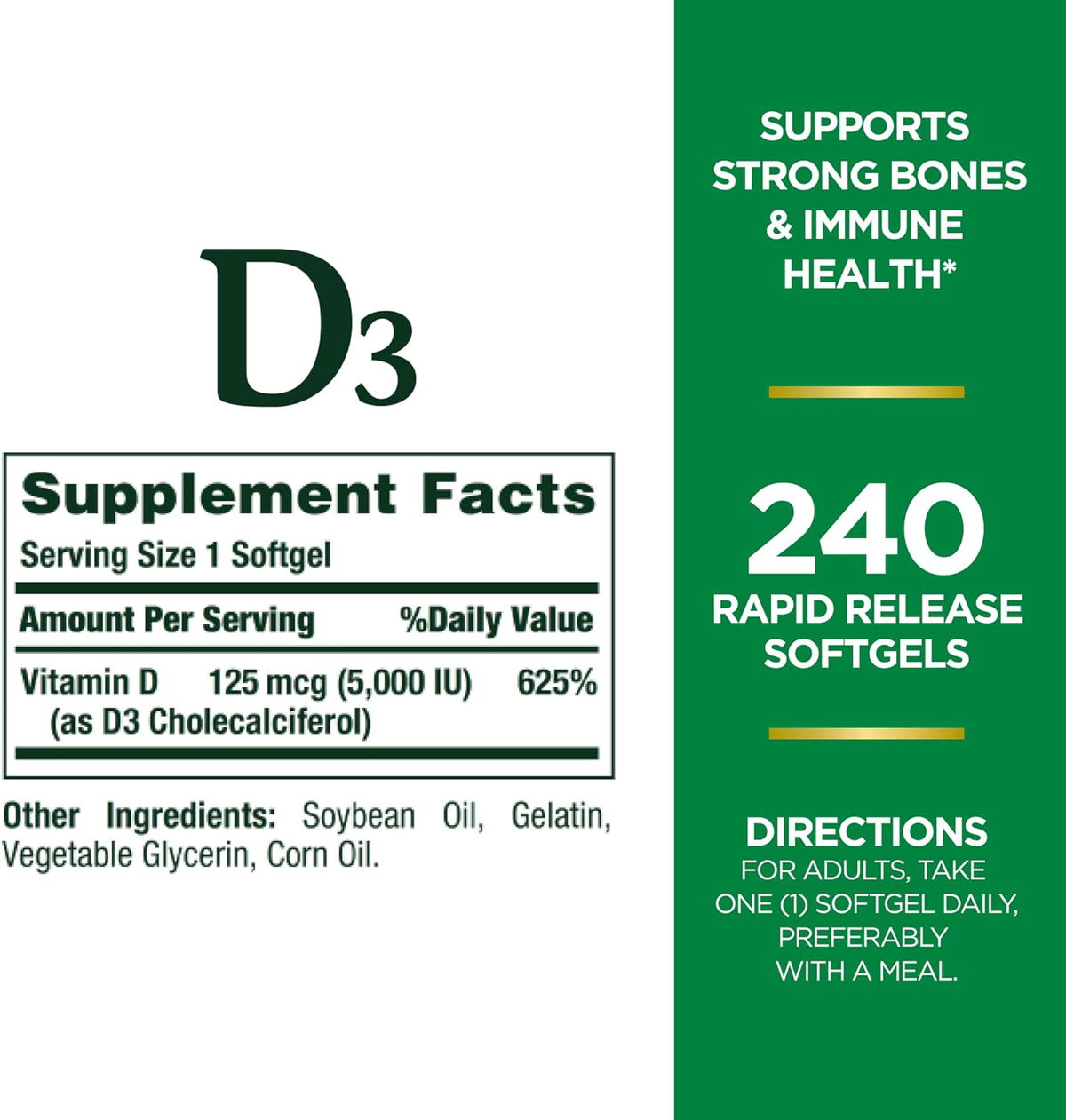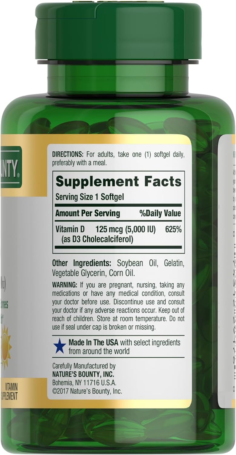 Nature's Bounty - Vitamina D3 para ayudar al sistema inmunológico. Apoyo inmunitario. La vitamina D3 es un nutriente esencial para el apoyo inmunológico; cada porción contiene 125 mcg (5000iu) de vitamina D para beneficios inmunológicos y puede ayudar al sistema inmunológico ayudando a regular los linfocitos T y B.