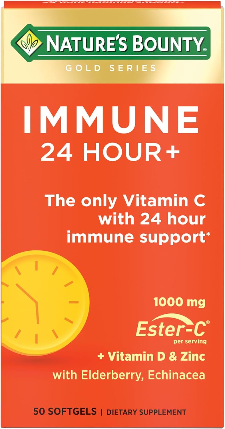 Apoyo inmunológico 24 horas: Nature's Bounty Immune 24 Hour + contiene la única vitamina C clínicamente estudiada con apoyo inmunológico las 24 horas del éster.