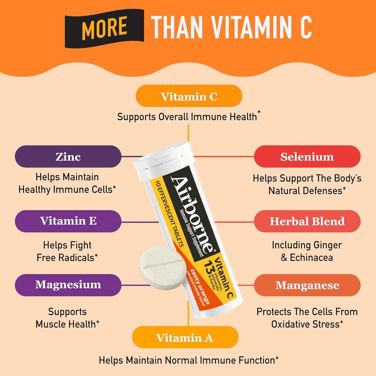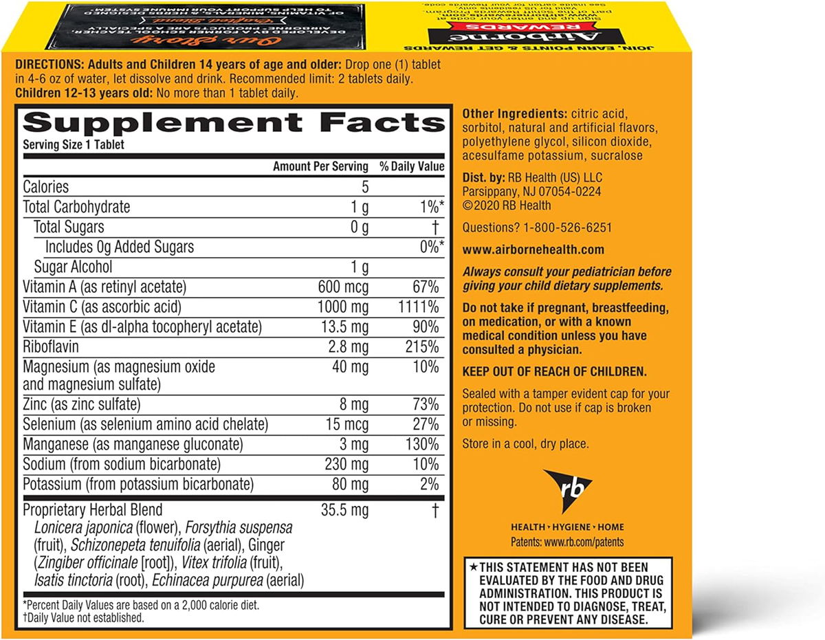 Las tabletas efervescentes originales Airborne ayudan a apoyar su sistema inmunológico con una mezcla hecha de vitamina C y 13 vitaminas, minerales y hierbas.