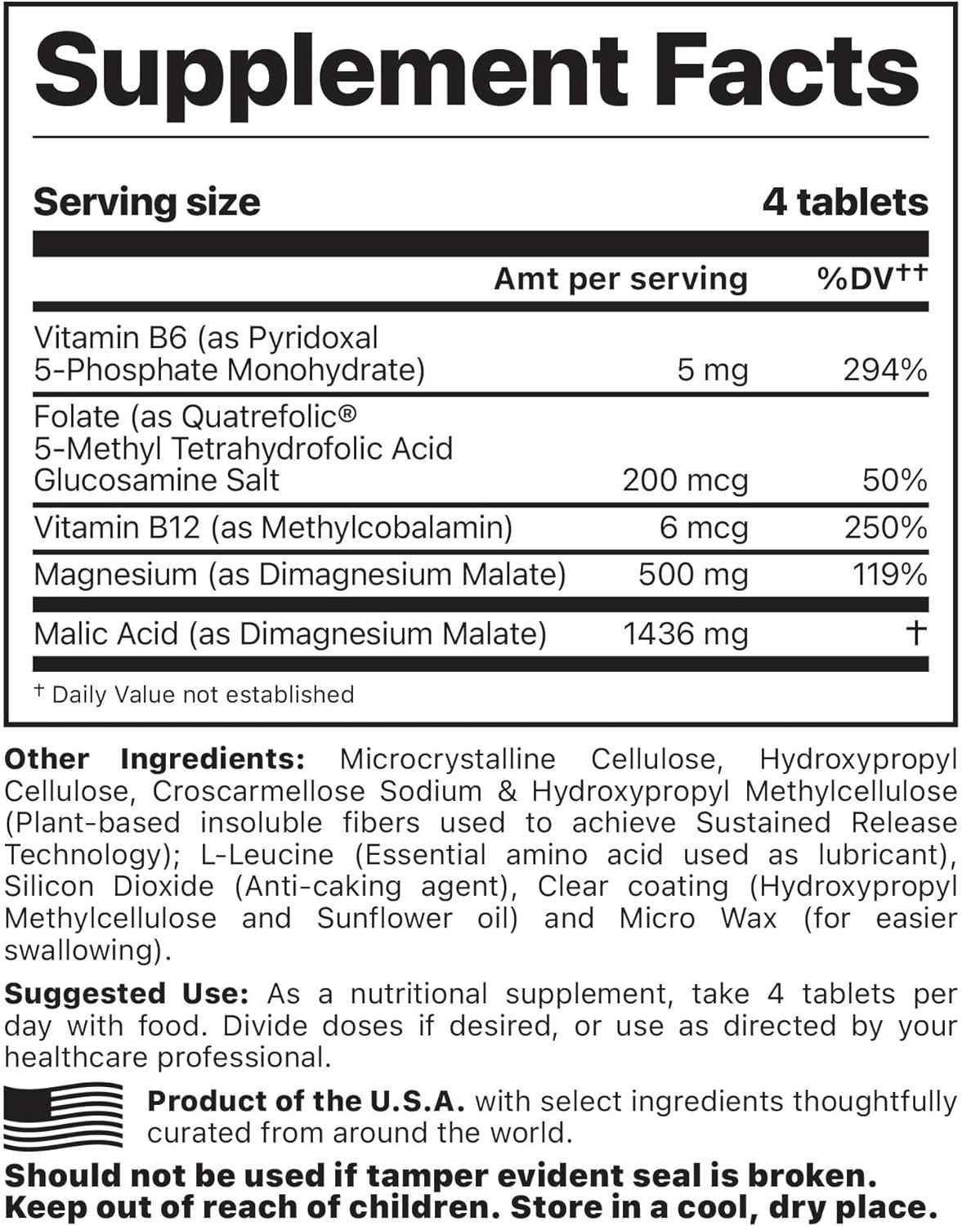 Magnesio (como malato de dimagnesio), vitamina B6 (como piridoxal-5-fosfato), folato (como Quatrefolic® 5MTHF), vitamina B12 (como metilcobalamina), ácido málico (como malato de dimagnesio).