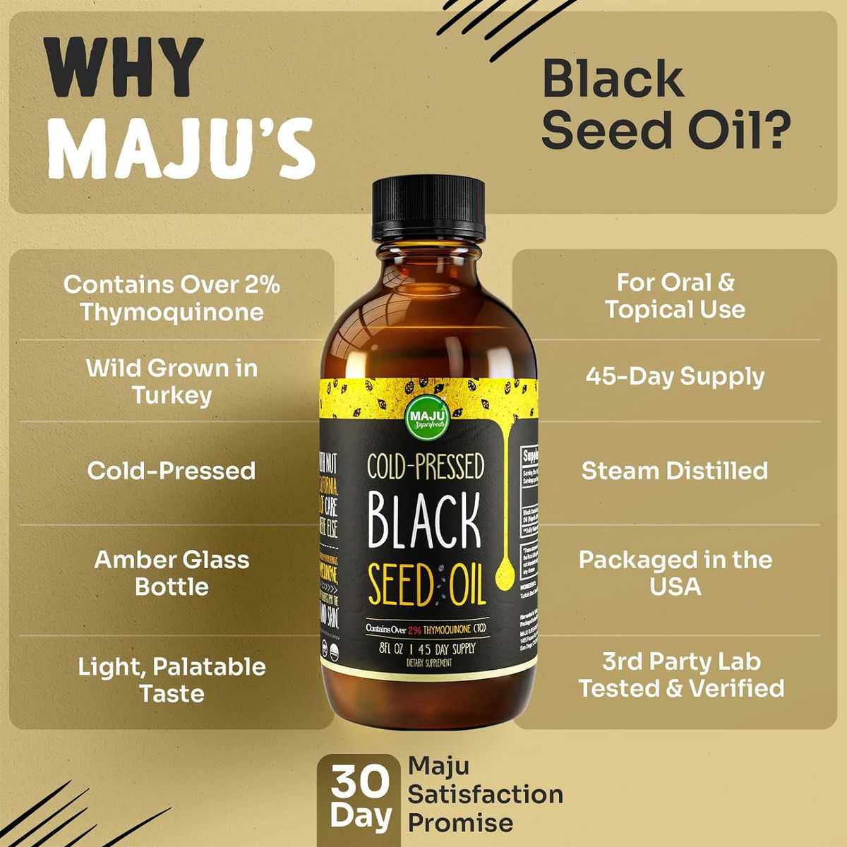 El aceite de semilla negra está lleno de nutrientes saludables para el corazón. El aceite de Maju está lleno de omegas 3, 6, 9 para apoyar la salud cardiovascular.