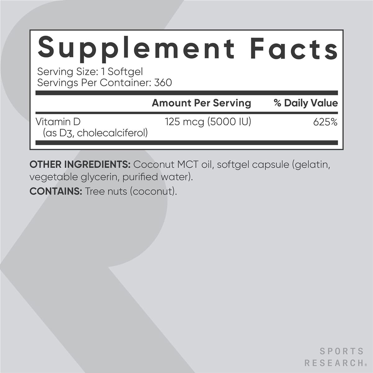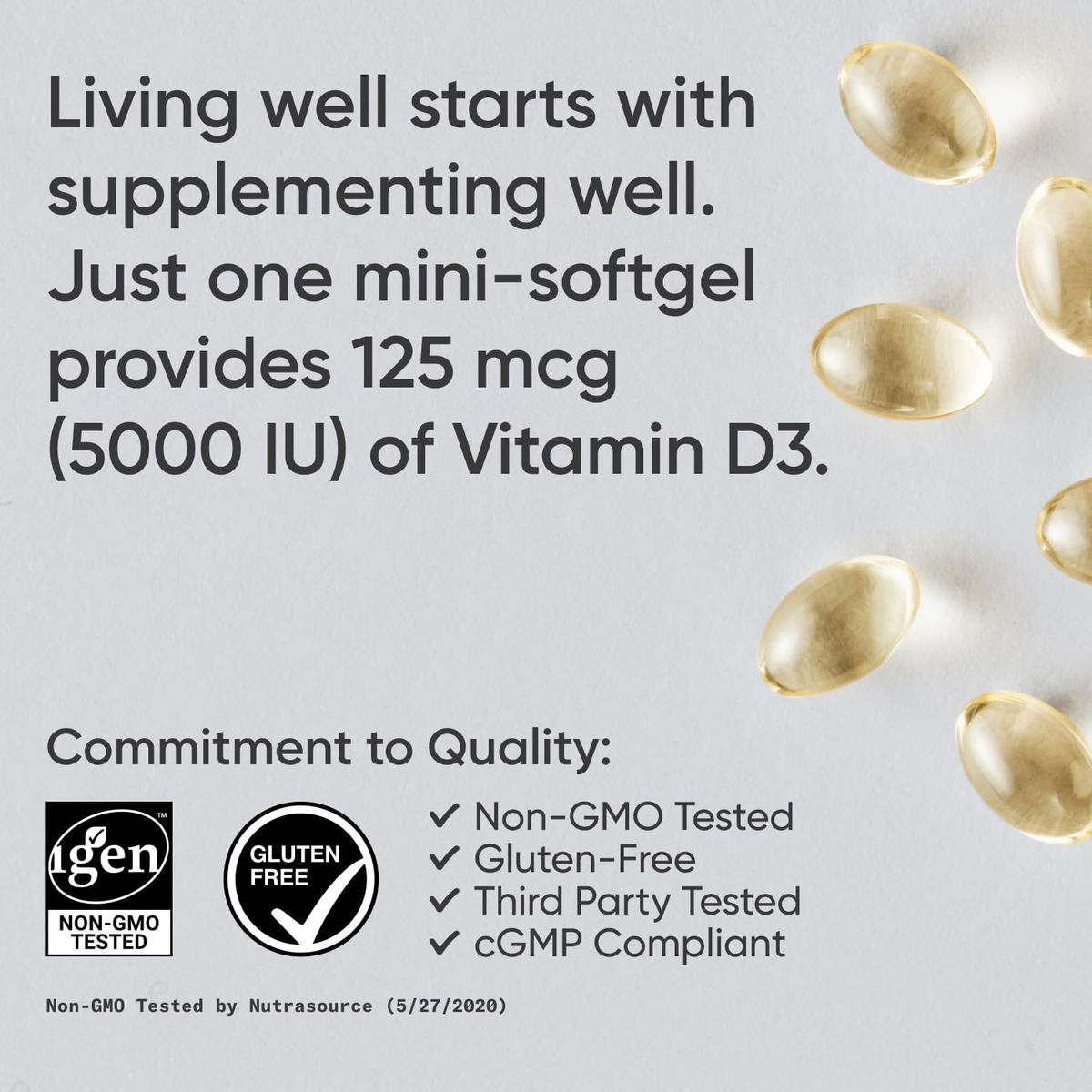 Contiene 5,000 iu (125 mcg) de Vitamina D3 (como colecalciferol) en una cápsula de gel líquido fácil de tragar.