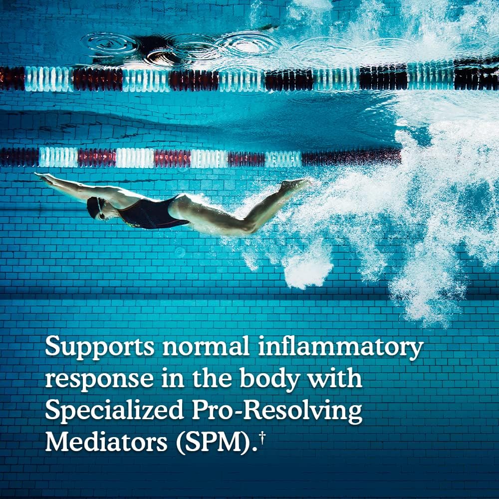 Suplemento Omega 3 de aceite de pescado formulado con más de 1000 mg de Omega-3 totales por porción y SPM, compuestos que apoyan las respuestas inflamatorias normales en el cuerpo