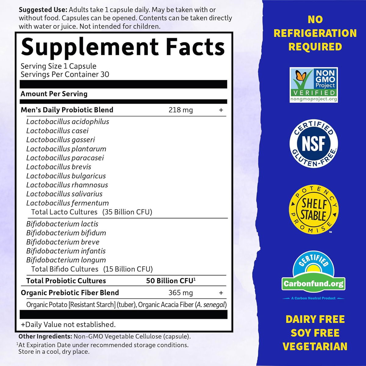 Mezcla diaria de probióticos para hombres: Lactobacillus acidophilus, Lactobacillus casei, Lactobacillus gasseri, Lactobacillus plantarum, Lactobacillus paracasei, Lactobacillus brevis, Lactobacillus bulgaricus, Lactobacillus rhamnosus, Lactobacillus salivarius, Lactobacillus fermentum; Bifmentum; Idobacterium Lang actis, Bifidobacterium bifidum, Bifidobacterium breve, Bifidobacterium infantis, Bifidobacterium longum. Mezcla de fibra prebiótica orgánica: patata orgánica [almidón resistente] (tubérculo), fibra de acacia orgánica (A. senegal). Otros ingredientes: Celulosa vegetal sin OMG (cápsula). Fabricado sin ingredientes lácteos o de soja, cacahuete, nueces de árbol o mariscos. Fabricado en una instalación que también procesa soja, lácteos, maní, nueces de árbol y mariscos. Sin colorantes artificiales ni conservantes.