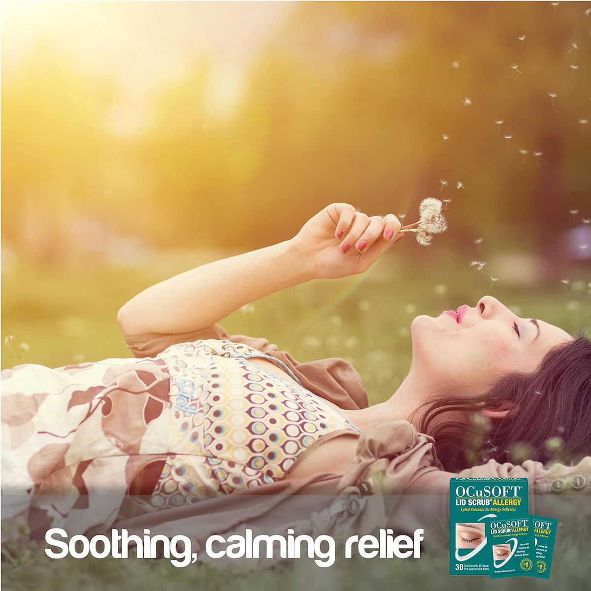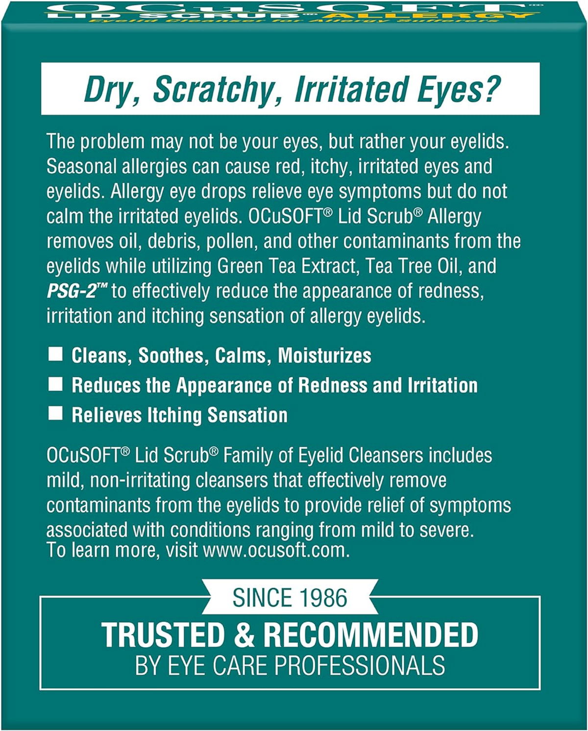 El limpiador de párpados OCuSOFT Lid Scrub Allergy es una fórmula sin enjuague que elimina aceite, residuos, polen y otros contaminantes de los párpados mientras utiliza extracto de té verde, aceite de árbol de té y PHNG-2 (fitosfingosina) para calmar el alivio de los párpados alérgicos.