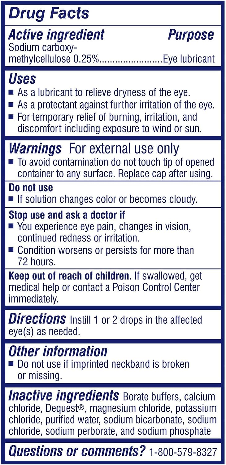 Ingredientes activos: carboximetilcelulosa de sodio (0,25%). Propósito: lubricante ocular. Ingredientes inactivos: tampones de borato, cloruro de calcio, dequest, cloruro de magnesio, cloruro de potasio, agua purificada, bicarbonato de sodio, cloruro de sodio, perborato de sodio y fosfato de sodio.