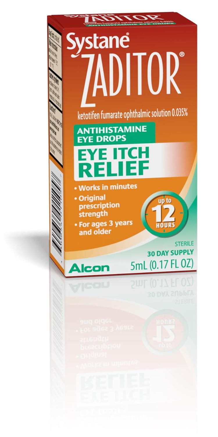 Lucha contra los alérgenos que causan picazón en los ojos con las gotas antihistaminas Systane Zaditor. A diferencia de la mayoría de las gotas para los ojos de venta libre, Systane Zaditor es la fórmula original de triple acción y fuerza de receta que funciona en minutos para ofrecer hasta 12 horas de alivio de la picazón ocular.