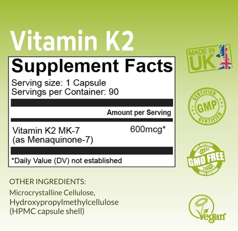 Vitamina K2 600 mcg, celulosa microcristalina, cápsula vegetariana.