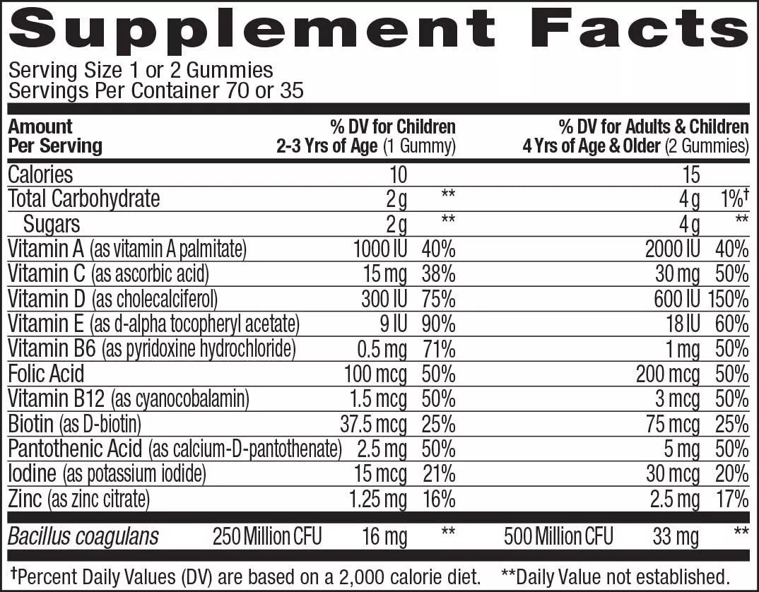 Esta vitamina para niños ofrece una mezcla de vitaminas A, C, D, E, B y zinc, además de una súper dosis de probióticos (los buenos insectos) para ayudar a apoyar bacterias del vientre sanas y un fuerte sistema inmunológico.