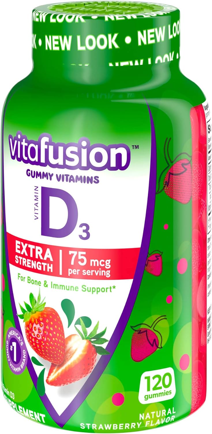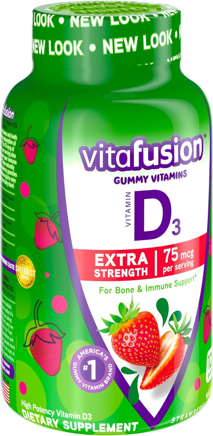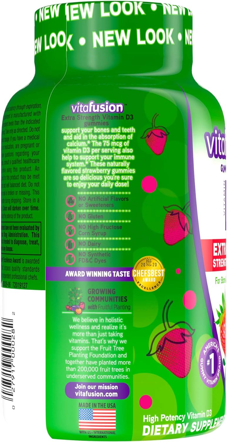 Vitafusión La vitamina D3 extra fuerte fusiona deliciosa y nutritiva. Dos gomitas extra fuertes D3 proporcionan 75 mcg (3000 UI) - 375% de valor diario - de vitamina D por porción. La vitamina D, también conocida como la vitamina del sol, ayuda en la absorción de calcio para ayudar a mantener huesos y dientes fuertes