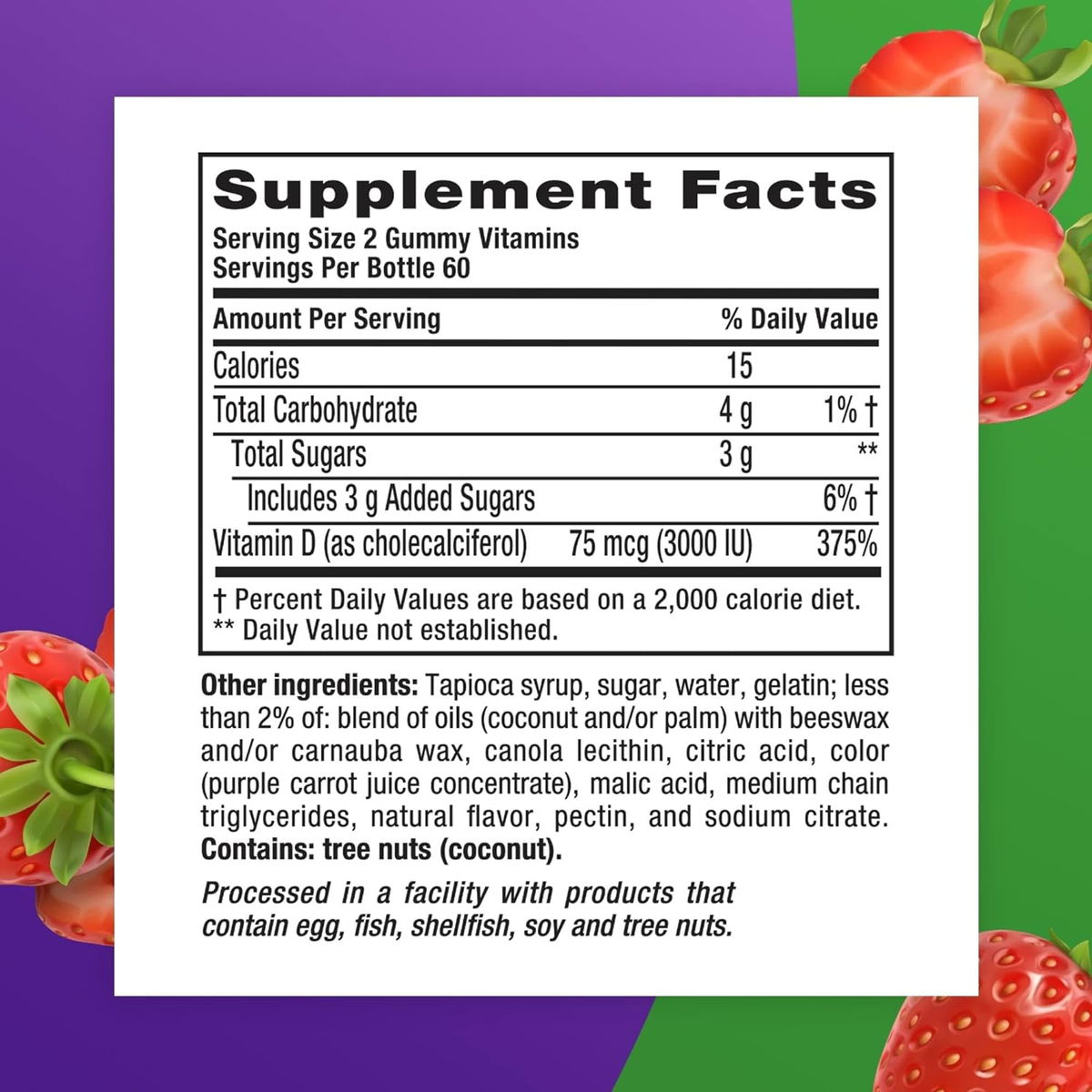 Vitafusion, Gomitas con Fuerza Extra de Vitamina D3. Sabor Natural de fresa. Sin gluten y jarabe de maíz de alta fructosa.