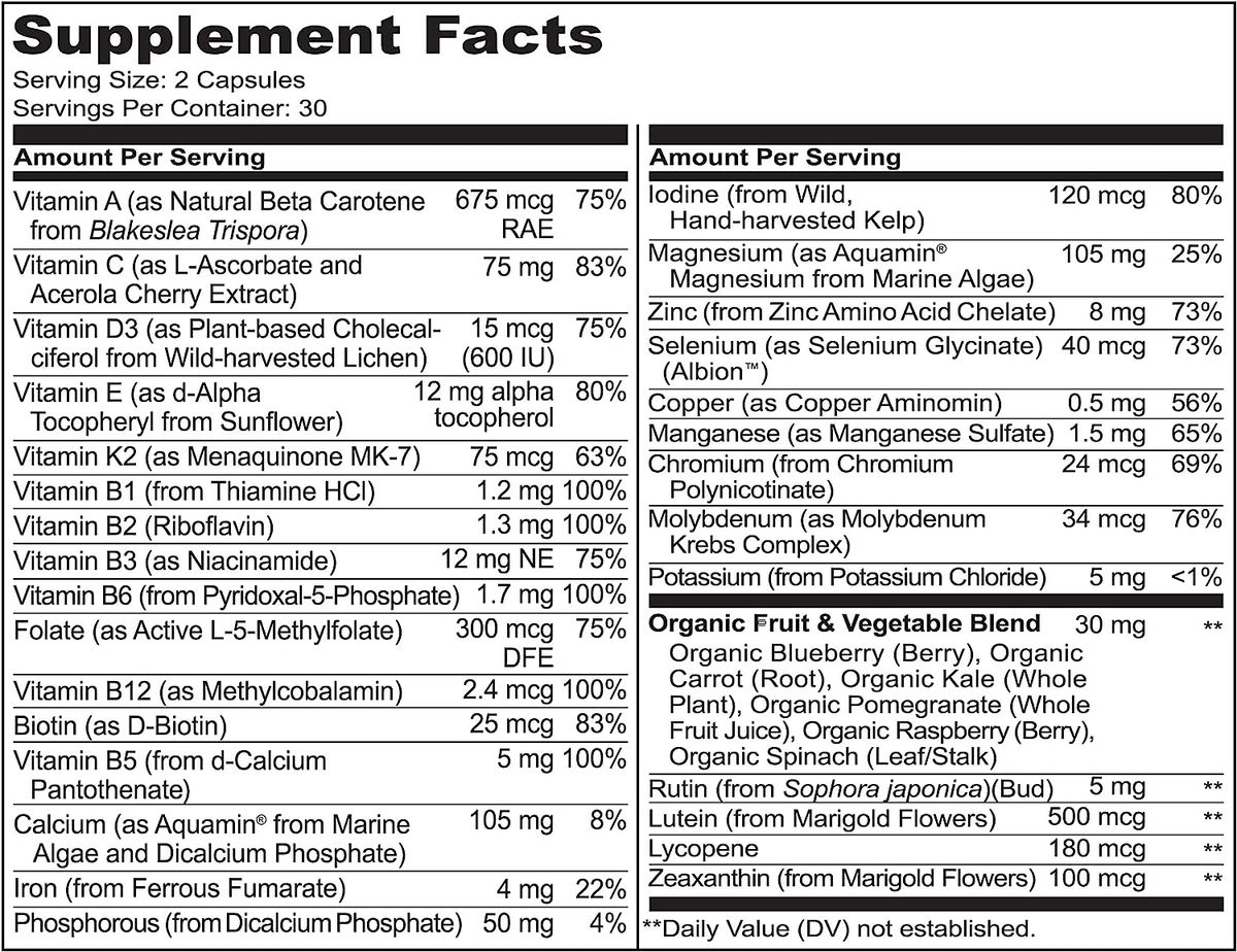 Beta caroteno, vitamina C, vitamina D3, vitamina E, vitamina K2 (MK-7), vitamina B1, vitamina B2, vitamina B3, vitamina B6 (P-5-P), folato (L-5-MTHF), vitamina B12 (metilcobalamina), biotina, vitamina B5, calcio, hierro, fósforo, yodo, magnesio, zinc, selenio, cobre, Manganeso, Cromio, Manganum, molibdeno, potasio, mezcla orgánica de frutas y verduras (arándano, zanahoria, col rizada, granada, frambuesa, espinaca), rutina, luteína, licopeno, zeaxantina. Otros ingredientes: cápsula de celulosa vegetal.