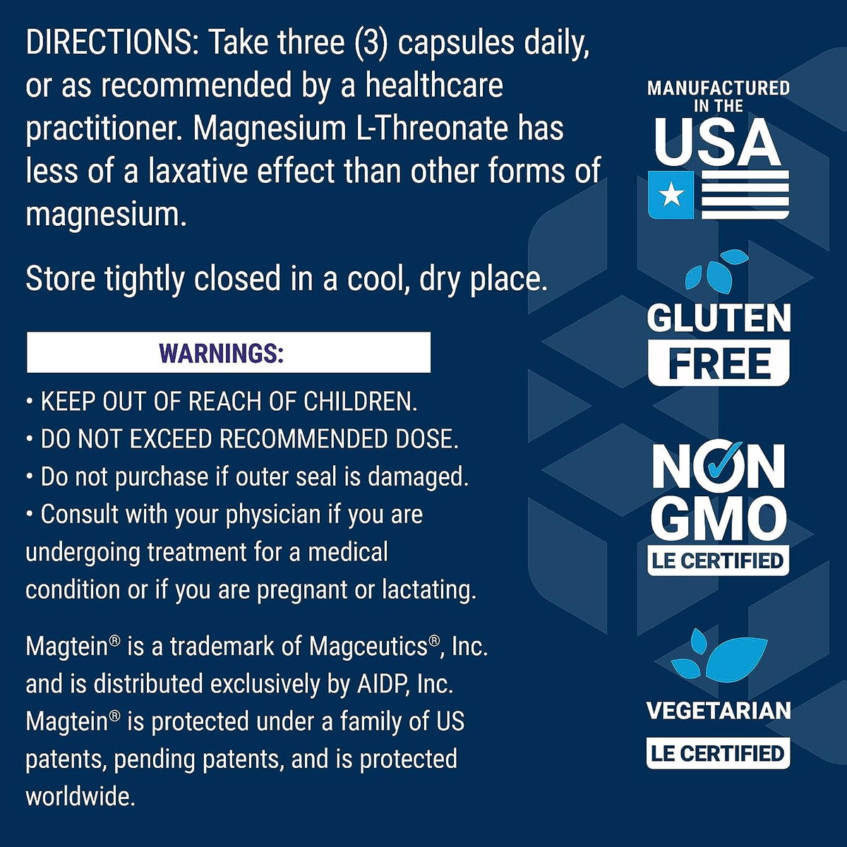 Magnesio (a partir de 2000 mg Magtein™ L-treonato de magnesio) 144 mg. Otros ingredientes: celulosa vegetal (cápsula), celulosa microcristalina, ácido esteárico, sílice, estearato vegetal.
