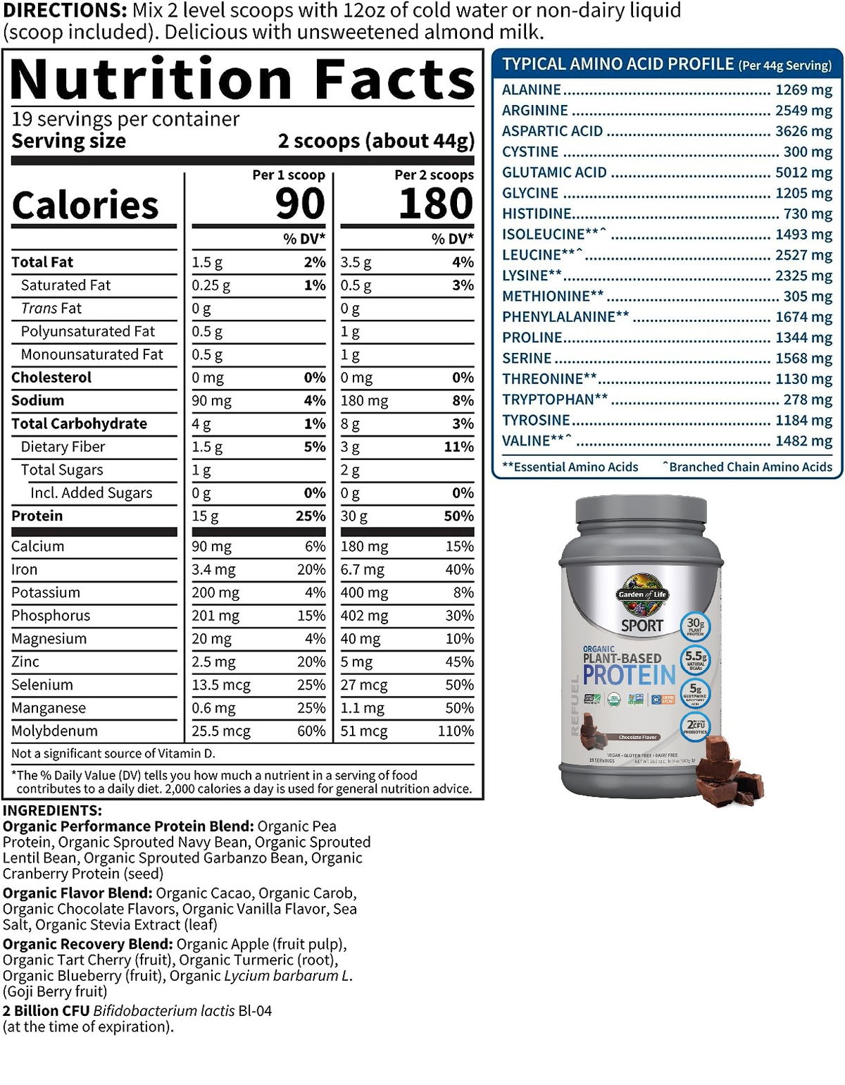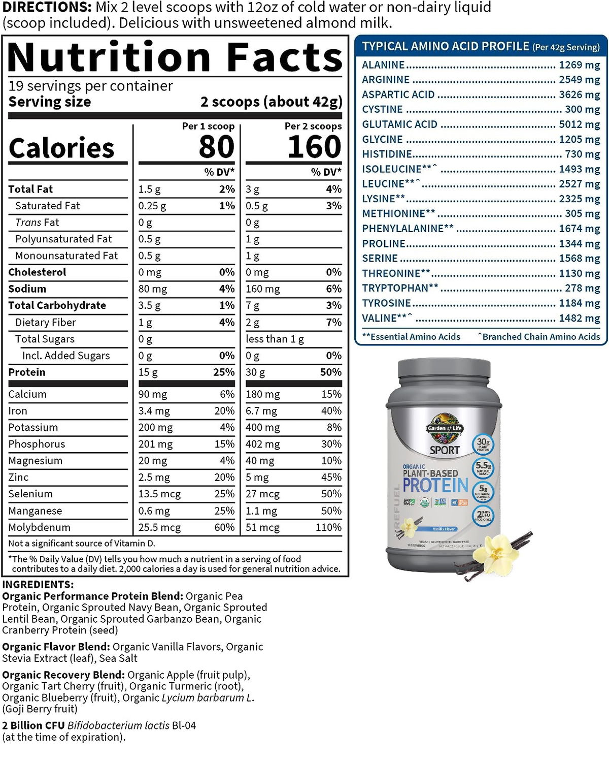 Mezcla de proteína de rendimiento orgánico: proteína de guisante orgánica, frijol azul marino germinado orgánico, frijol de lenteja germinado orgánico, garbanzo germinado orgánico, proteína de arándano rojo orgánico (semilla); Mezcla de sabores orgánicos: sabores de vainilla orgánicos, extracto de stevia orgánico (hoja), sal marina, mezcla de recuperación orgánica: manzana orgánica (pulpa de fruta), cereza ácida orgánica (fruta), cúrcuma orgánica (raíz), arándano orgánico (fruta), lycium orgánico barbarum L. (baya de Goji); 2 mil millones de UFC Bifidobacterium lactis Bl-04 (en el momento de la caducidad). Elaborado sin ingredientes lácteos o de soja, frutos secos, azúcares añadidos, ingredientes de relleno, ni colorantes, sabores, edulcorantes ni conservantes artificiales.