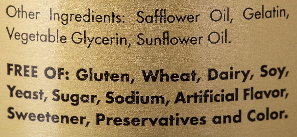 Vitamina D3 (como colecalciferol) Cantidad por porción: 10000 UI % Valor diario: 2500 %, Otros ingredientes: Aceite de cártamo, gelatina, glicerina vegetal.