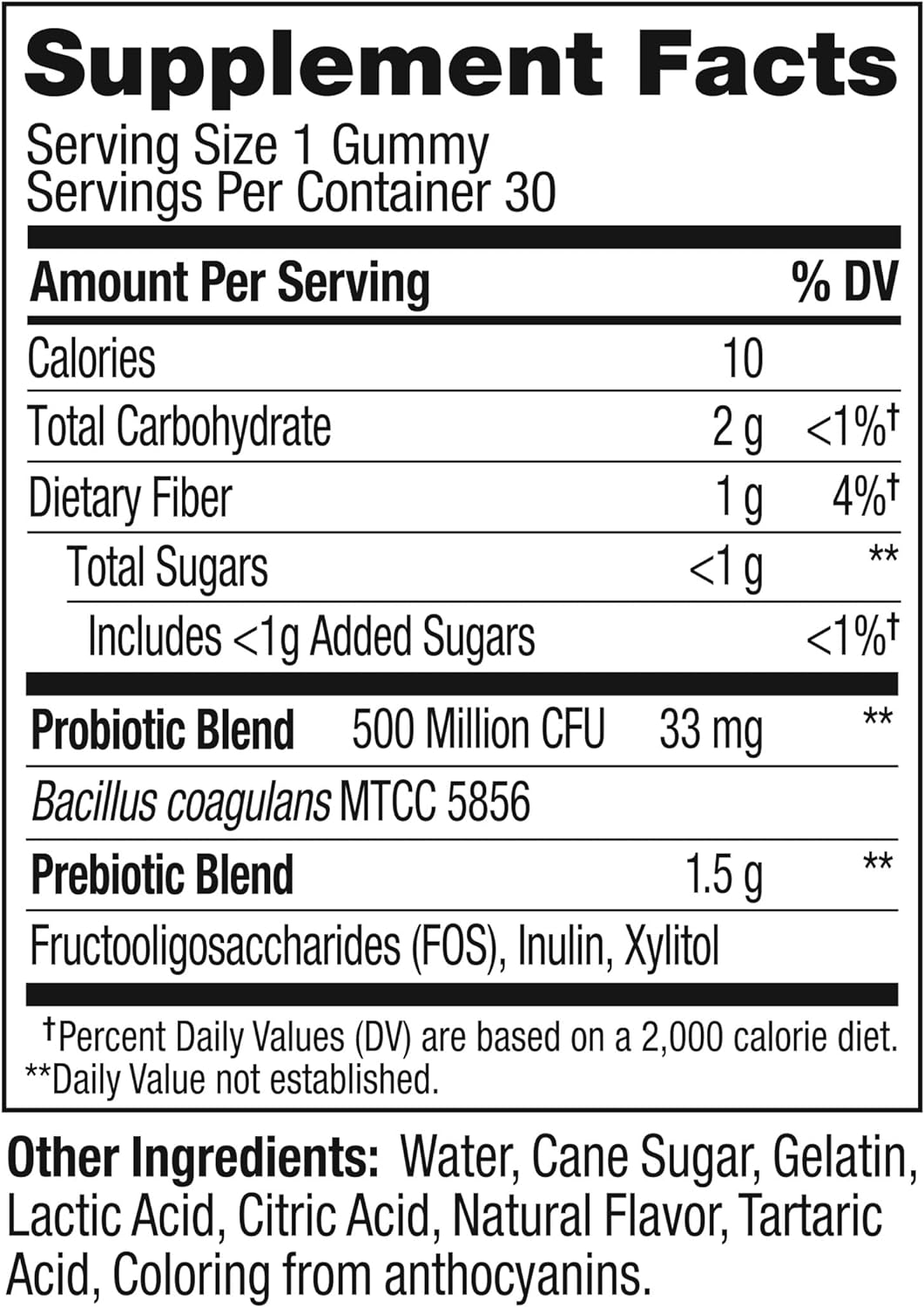 Probiotic Blend 500 Million CFU, Probiotic Blend. Otros ingredientes: agua, azúcar de caña, gelatina, ácido láctico, ácido cítrico, saborizante natural, ácido tartárico, colorante de antocianinas.