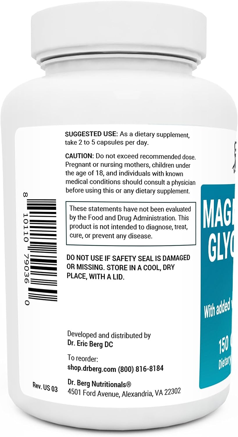 Las cápsulas de magnesio Dr. Berg son un suplemento fuerte que ayuda a mantener el magnesio a un nivel saludable. Con bisglicinato de magnesio y vitaminas añadidas D3 y B6, este suplemento de magnesio también te ayuda a sentirte tranquilo, digerir bien los alimentos y cuidar tu corazón. El quelato de glicinato de magnesio hace que el magnesio sea más biodisponible y no molesta tu estómago