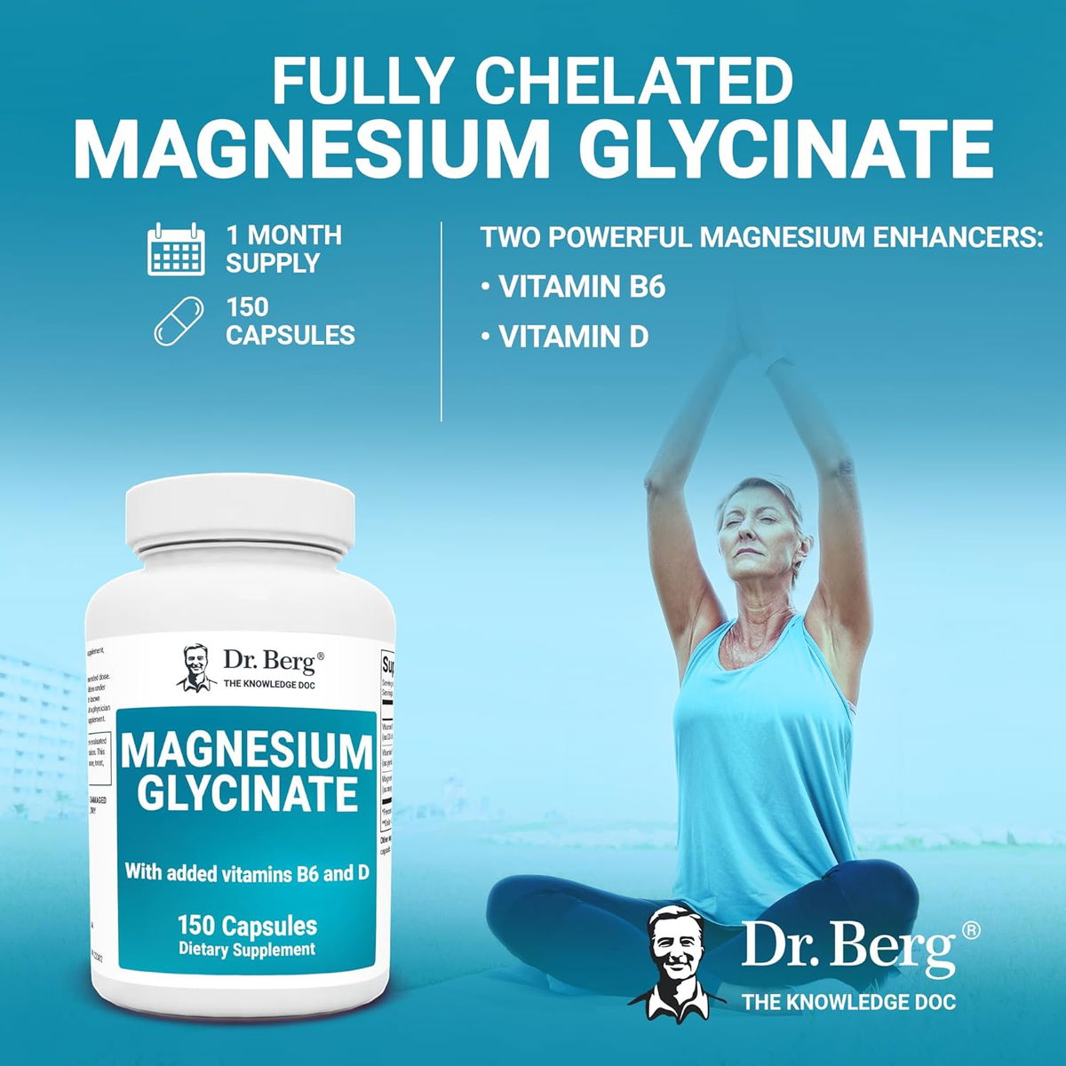 Dr. BERG Glicinato de magnesio de 400 mg - Cápsulas de glicinato de magnesio totalmente queladas para el estrés, la calma, la relajación y el sueño - Incluye glicinato de magnesio con vitamina D y B6 - Cápsulas vegetales