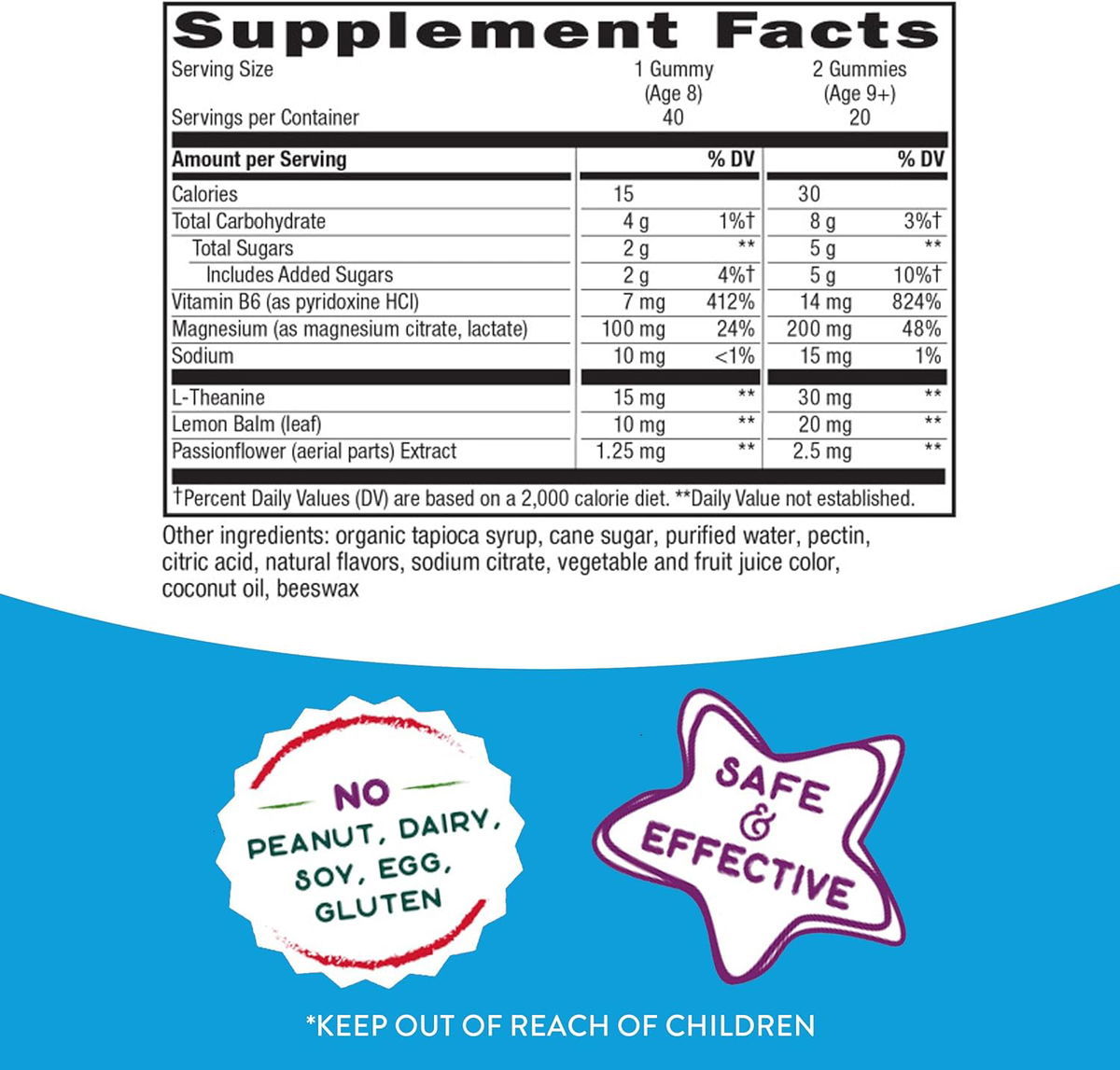 Vitamina B6 (como piridoxina HCl); Magnesio (como citrato de magnesio, lactato); L-teanina (Suntheanine®); Bálsamo de limón (hoja); Extracto de pasiflora (partes aéreas); azúcar de caña; jarabe de tapioca orgánico; agua purificada; pectina; ácido cítrico; sabores naturales; citrato de sodio; color de jugo de frutas y vegetales; Aceite de coco; Abejas cera