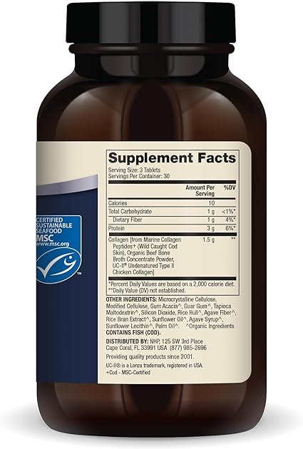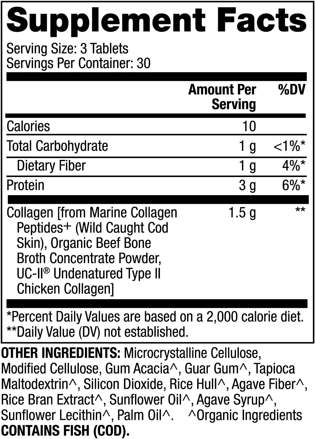 Colágeno [de colágeno marino, péptidos+ (piel de bacalao capturada salvaje), polvo concentrado de caldo de hueso de res orgánico, colágeno de pollo tipo II sin desnaturalizar UC-II]. OTROS INGREDIENTES: celulosa microcristalina, celulosa modificada, goma de acacia, goma guar, maltodextrina de tapioca, dióxido de silicio, cáscara de arroz, fibra de agave, extracto de salvado de arroz, aceite de girasol, jarabe de agave, lecitina de girasol, aceite de palma. Ingredientes orgánicos
